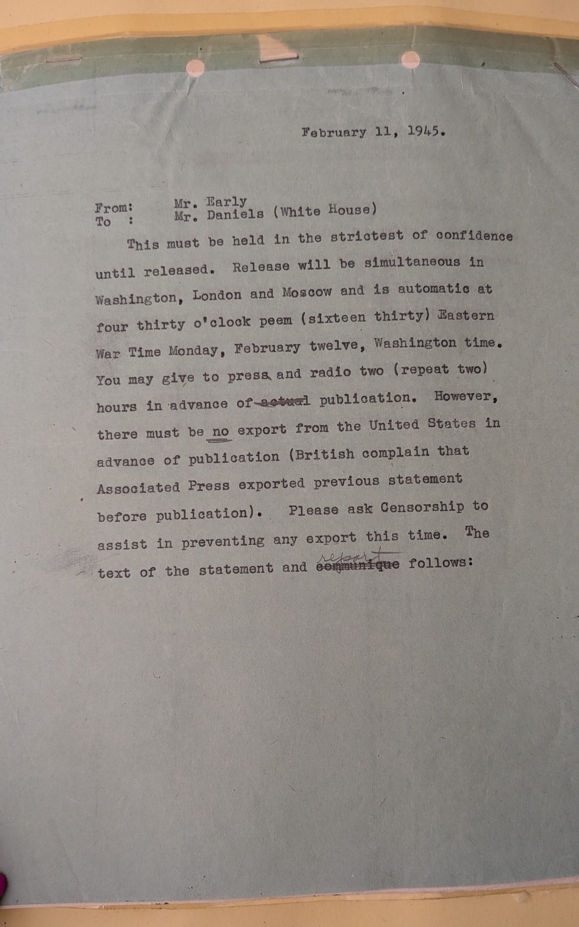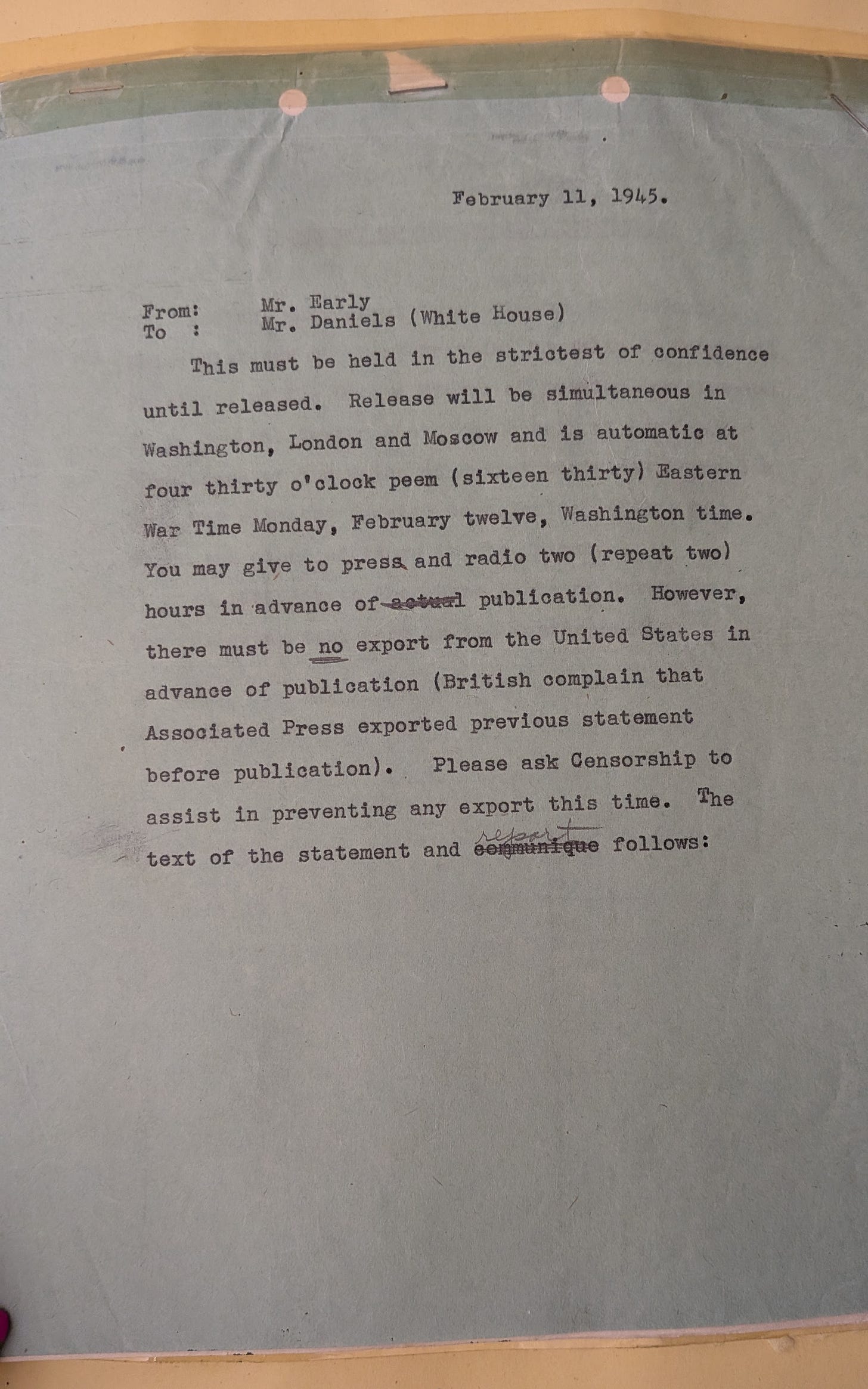 Some of the things I was able to handle felt truly momentous and special: the press release, with handwritten pencil notes in the margins, from the monumental conference at Yalta. To refresh your WWII memory, in case it’s been a while, that was the one where the Allied powers confirmed the final plans for defeating Nazi Germany, how Germany would be divided after the war, and basically invented the United Nations.