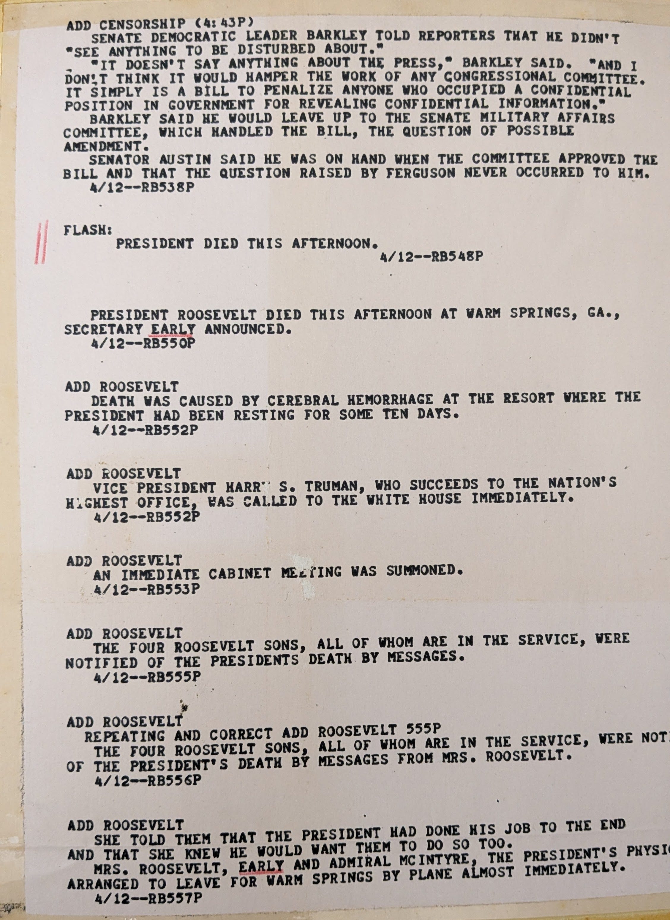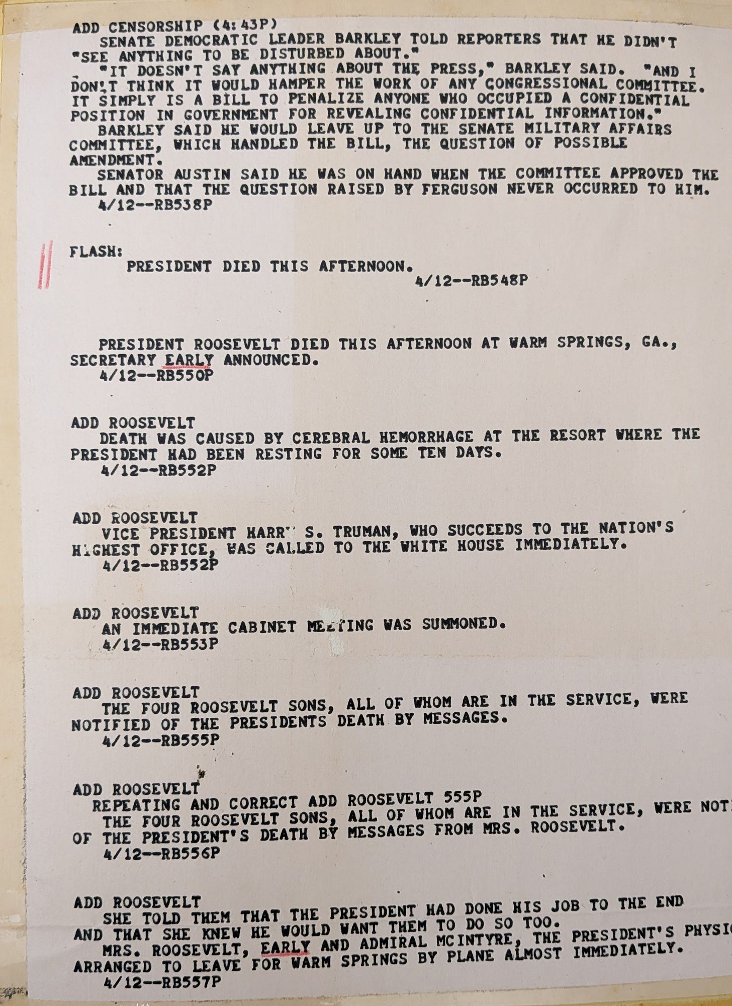 Below: a copy of the wire report (aka, OG Twitter) that came through when FDR died.